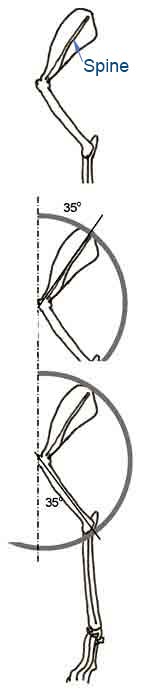 The upper arm should be laid back at the same angle away from the vertical as the shoulder blade. The angle makes the elbow appear to be tucked back under the body. The upper arm should be approximately equal in length to the shoulder blade.