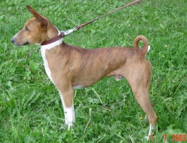 Comments: A rather tall boy at 19" with lovely color and a fairly square proportion. Exceptionally curly tail which wags well. Slow to mature in mind and body. Very free, easy movement with sound coming and going. Has particularly nice shaped bone and feet. Rather untypical long head. Per new Owner Tia (12/2003): "He is an extremely sociable character and has started competing in lure coursing in which his speed and stamina are incredible. However, he is not interested in track racing as he does not find it 'truthful' enough. He has been to few shows here in Finland - with no success. He is very outgoing character but somewhat shy in the middle of the ring and he is not keen on being stacked as he does not understand the point of standing still..." |