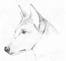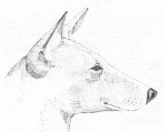 Bull-terrier type head with long muzzle, filled between the eyes and